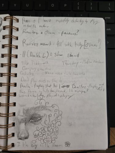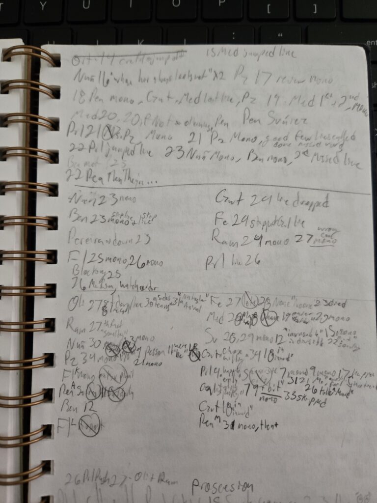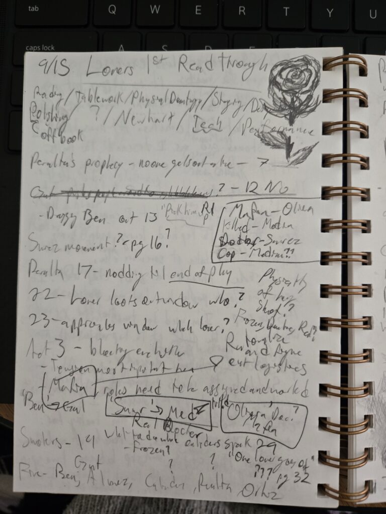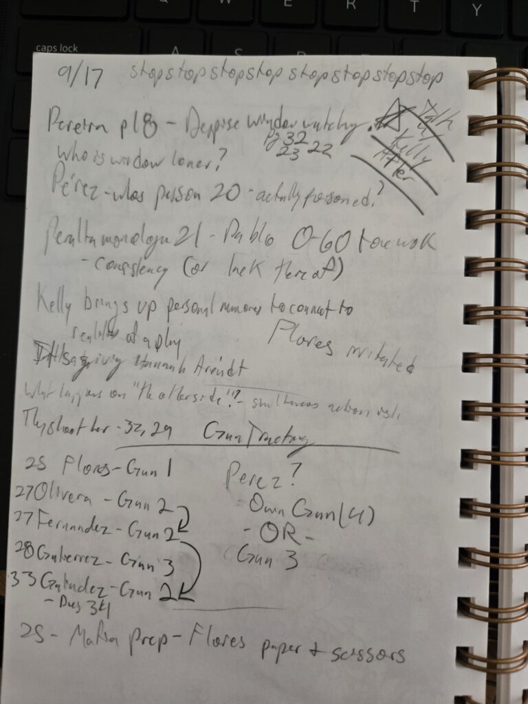 Samples of notes taken during rehearsals and tech. It includes a visualization of my thought process on tracking the guns used in the show as well as the roles in the game of mafia within the play.
