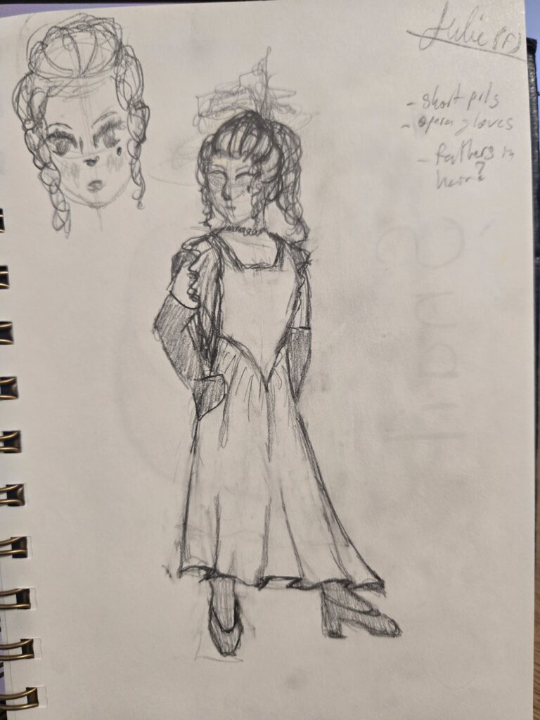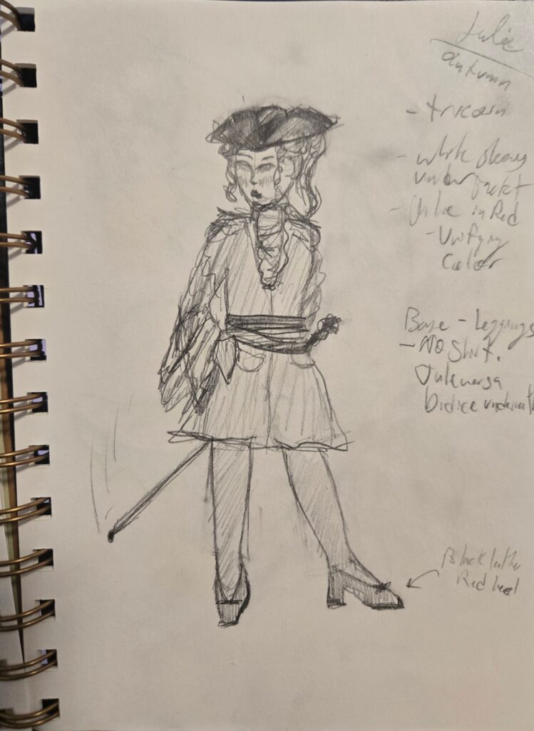 I was put on this project as the costume designer three weeks prior to opening night. My priority was to pull, relying on my research to guide the design in my head. At some point I would like to make renderings..